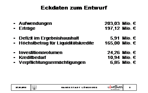 Heute präsentiere ich Ihnen den Haushaltsplan 2012 mit den folgenden Eckdaten, die können sich durch Beschlüsse, die am heutigen Tage gefasst werden, noch verändern.