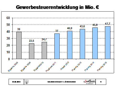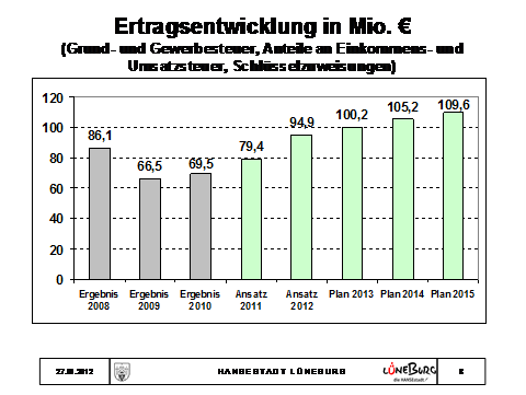 Für das Jahresergebnis 2011 rechne ich mit Gewerbesteuererträgen von rund 37 Mio. . Damit liegen wir deutlich über der Planzahl von 28,8 Mio. . Das Ergebnis in Lüneburg entspricht damit auch dem bundesweiten Trend, zuletzt festgehalten und bestätigt in der jährlichen November-Steuerschätzung. Für 2012 ergibt sich unter Berücksichtigung des neuen Hebesatzes ein Planansatz von rund 41 Mio. , womit wieder das Niveau des Jahres 2008 erreicht wäre.