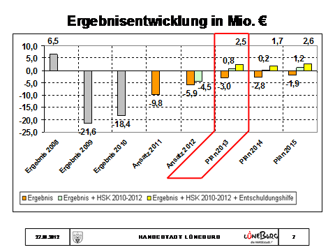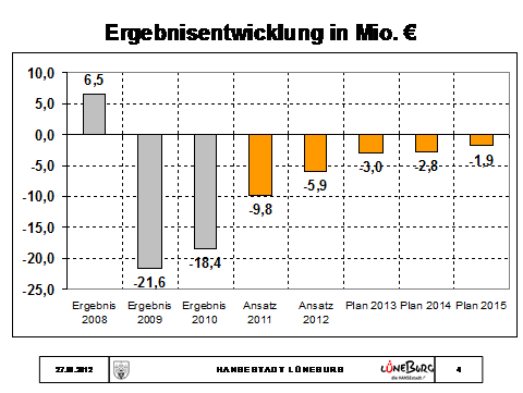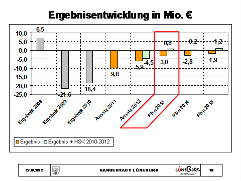 Wir erwarten insofern, dass wir im Jahr 2013 einen ausgeglichenen Haushalt wieder vorlegen können bzw. beschließen können. Wenn man die Situation seit 2009 betrachtet, hätten wir vielleicht damit nicht rechnen können, schon zu diesem Zeitpunkt wieder von einem ausgeglichenen Haushalt ausgehen zu können. Sicherlich trägt auch die Konjunkturlage im Moment erheblich dazu bei und wenn man die Unternehmer in Lüneburg hört, dann haben die auch eine Konjunktursituation, die uns diese Gewerbesteuerprognose ermöglicht, die wir vorhin von Frau Lukoschek gehört haben.