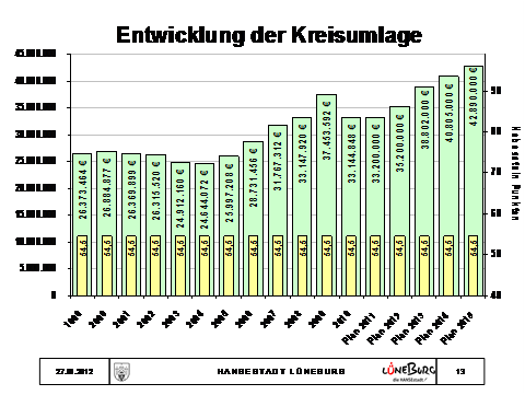 Der Landkreis wird nächste Woche mit dem Land Niedersachsen einen Zukunftsvertrag mit einer Entschuldungshilfe abschließen. Im Vertrag ist zugunsten der kreisangehörigen Kommunen geregelt, dass der Hebesatz der Kreisumlage bis 2014 um 1,5 Punkte auf dann noch 53 Punkte sinken wird. Hier gibt der Landkreis seine Entlastung weiter, die er aufgrund der Übernahme der Kosten der Grundsicherung durch den Bund erhält.