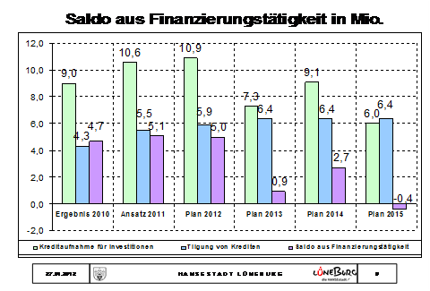 Die Nettoneuverschuldung - also die Kreditaufnahme abzüglich der regelmäßigen Tilgung wird in 2012 unter 5 Mio. sinken und in den Folgejahren noch weiter zurückgehen. In der Prognose werden wir erstmals in 2015 Schulden abbauen können. Sie sehen das an dem kleinen lila Balken in 2015 das erste Mal die entgegensetzte Richtung anzeigt.