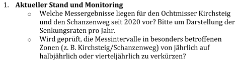 - Derzeit werden die Höhenmessbolzen am Schanzenweg alle 2 Jahre (104 Wochen) sowie am Ochtmisser Kirchsteig alle 6 Wochen (Extensometer alle 2 Wochen) gemessen.