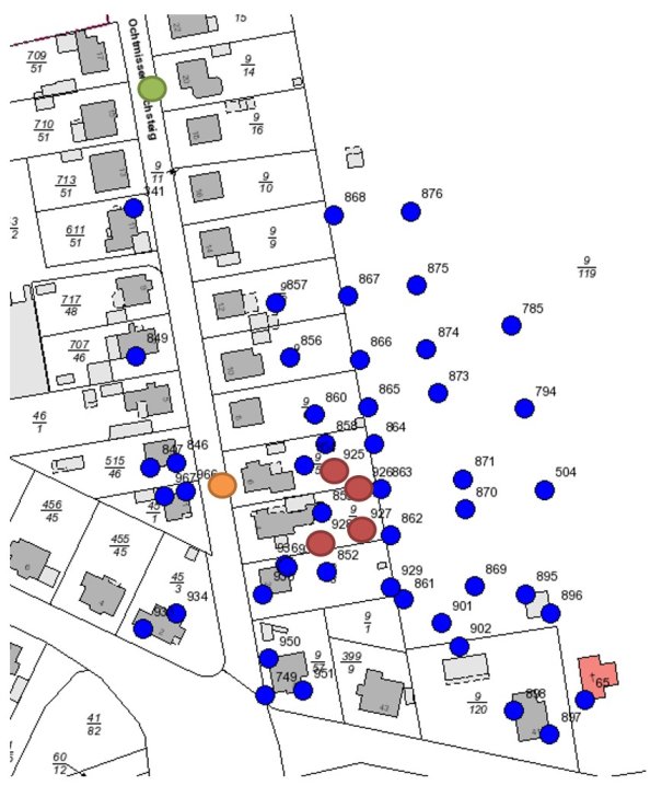 An den Messpunkten wurden in den Zeiträumen Senkungen unterschiedlicher Größenordnungen zwischen 0,5 cm (grüne Markierung) und 15,3 cm (orange Markierung) bezogen auf 2 Jahre festgestellt. Darüber hinaus gab es auch vier Werte, die zwischen 30 bis 47 cm / 2 Jahre weit darüber lagen. Sie wurden 2020 gemessen. Die Punkte dieser Werte sind in der nachfolgenden Karte rot markiert: