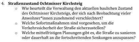 - Der bauliche Zustand der Straße „Ochtmisser Kirchsteig“ zwischen dem Bögelkreisel und der Einmündung Schomakerstraße (400 m) ist befriedigend. Im südlichen Bereich, die ersten 60 m bis zur Hausnummer 6, hat es einige Verwerfungen in der Straßenoberfläche gegeben, die mittelfristig beseitigt werden sollen. Die Verwerfungen sind jedoch nicht so stark ausgeprägt, dass bei angemessener Fahrweise (20 km/h) kurzfristig gehandelt werden muss.