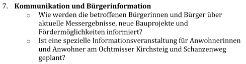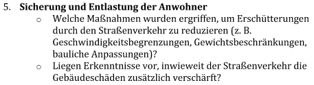 - Sofortmaßnahmen für die Verkehrssicherheit sind nicht vorgesehen, da nicht erforderlich. Teilbereiche des Asphalts wurde bereits gegen Pflaster ausgetauscht, um so kurzfristig auftretende Senkungsschäden ohne schweren Maschineneinsatz beheben zu können. Dieses Verfahren hat sich die letzten Jahre bewährt.