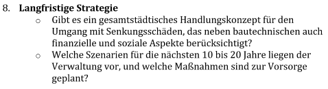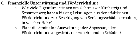 - Eine städtische Förderrichtlinie zur Beseitigung von Senkungsschäden gibt es nicht. Demnach sind auch keine Förderleistungen erfolgt.