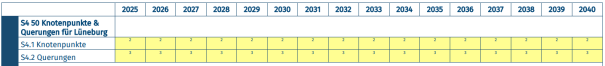 Aus den Umsetzungshinweisen des NUMP zum Maßnahmensteckbrief S4 geht hervor, dass die Hansestadt Lüneburg pro Jahr mindestens drei Querungen oder Querungshilfen im Stadtgebiet bearbeitet und verbessert. Hierfür sind jährlich mindestens 250.000 Euro erforderlich.