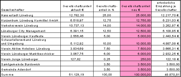 2 Der Verkehrsverein Lüneburg e. V. ist bereit, seinen Anteil am Stammkapital von 21 % auf 14 % zu senken, so dass die beiden neuen Gesellschafter vom Verkehrsverein Lüneburg e. V. jeweils 3,5 % des auf 100.000 Euro festgesetzten Stammkapitals erwerben können.