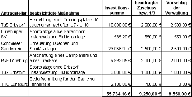 Der Sportausschuss beschließt, dem TuS Erbstorf für die Herrichtung eines Trainingsplatzes für Jugendmannschaften sowie für die Instandsetzung der Flutlichtanlage einen Gesamtbetrag von 3.500 €, der Lüneburger Sportvereinigung für die Instandsetzung der Flutlichtanlage 550 €, dem Ochtmisser Sportverein für die Erneuerung der Dusch- und Sanitäranlagen 2.500 € und dem Reit- und Fahrverein Lüneburg für die Anschaffung eines Bahnplaners und Treckers 2.000 €, als Zuschuss zu gewähren.