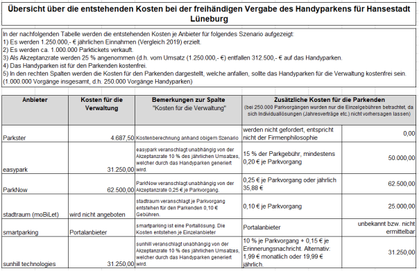 Zusammenfassend ist festzustellen, dass die Firma Parkster aus Sicht der Verwaltung die geeignetste Lösung für die Hansestadt Lüneburg anbietet.