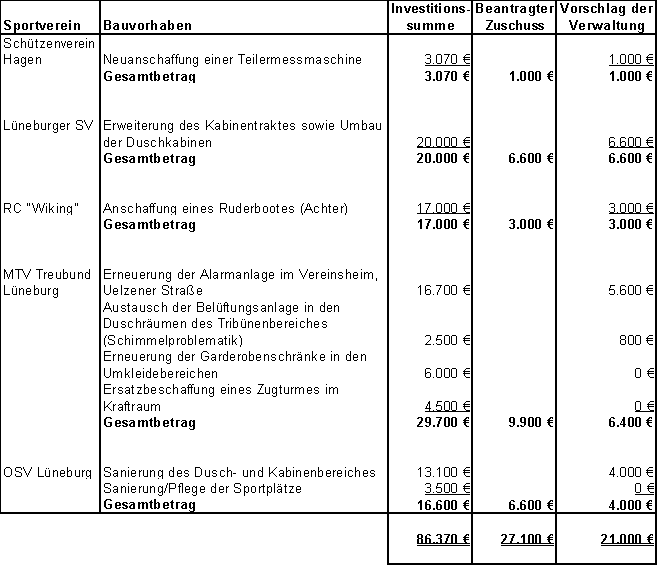 verbliebenen Restmittel, schlägt die Verwaltung vor, den Sportvereinen folgende